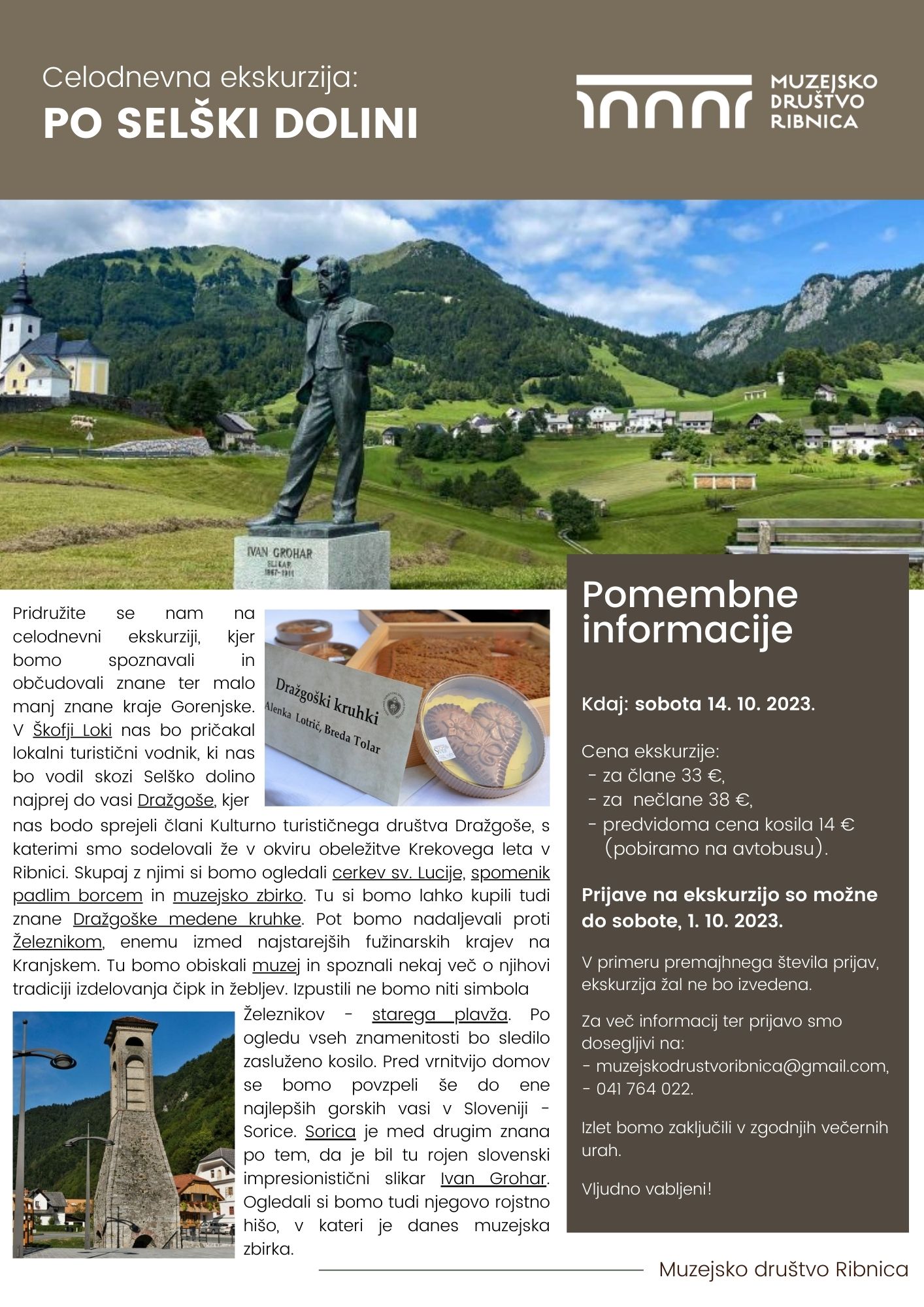 Muzejsko društvo Ribnica vas v soboto 14. oktobra 2023 vabi na celodnevno ekskurzijo po Selški dolini.